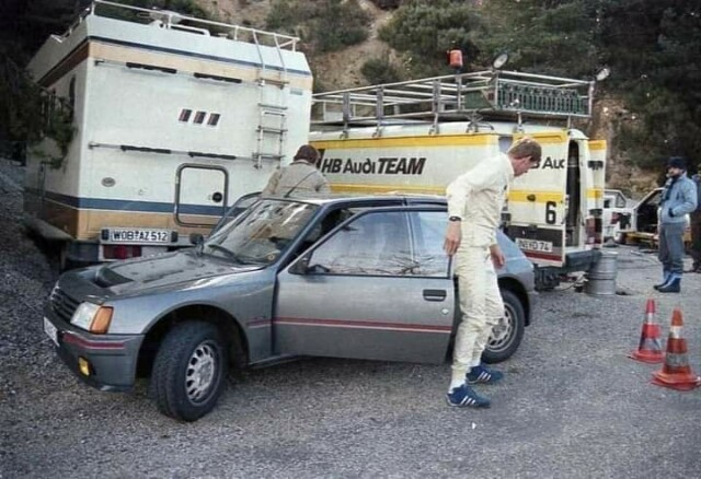 Зад буса се вижда Ауди Куатро гр.Б. Такова ако не бъркам в България е идвало през 1985 на Демут и 1986 на Ферианц и Бош. На снимката май не е нито едно от трите. Отделно след 1986 гр. Б е забранена. А в Пежото 205 Т16 като че ли е Валтер Рьол.